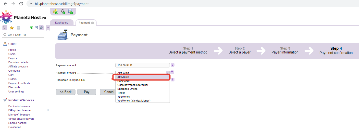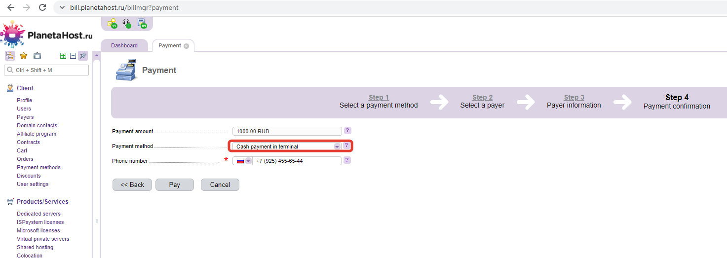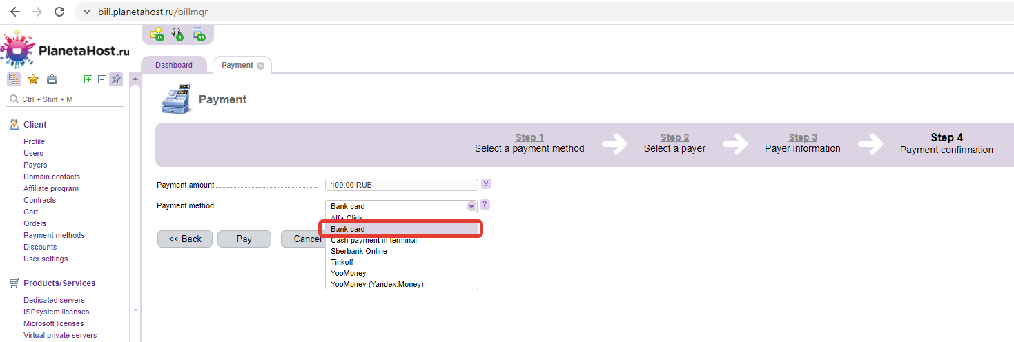 You need to choose a payment method and indicate the amount you would like to top up your account. We choose the payment method YooKassa (LLC "PLANETAHOST") and indicate the amount of replenishment of the account: