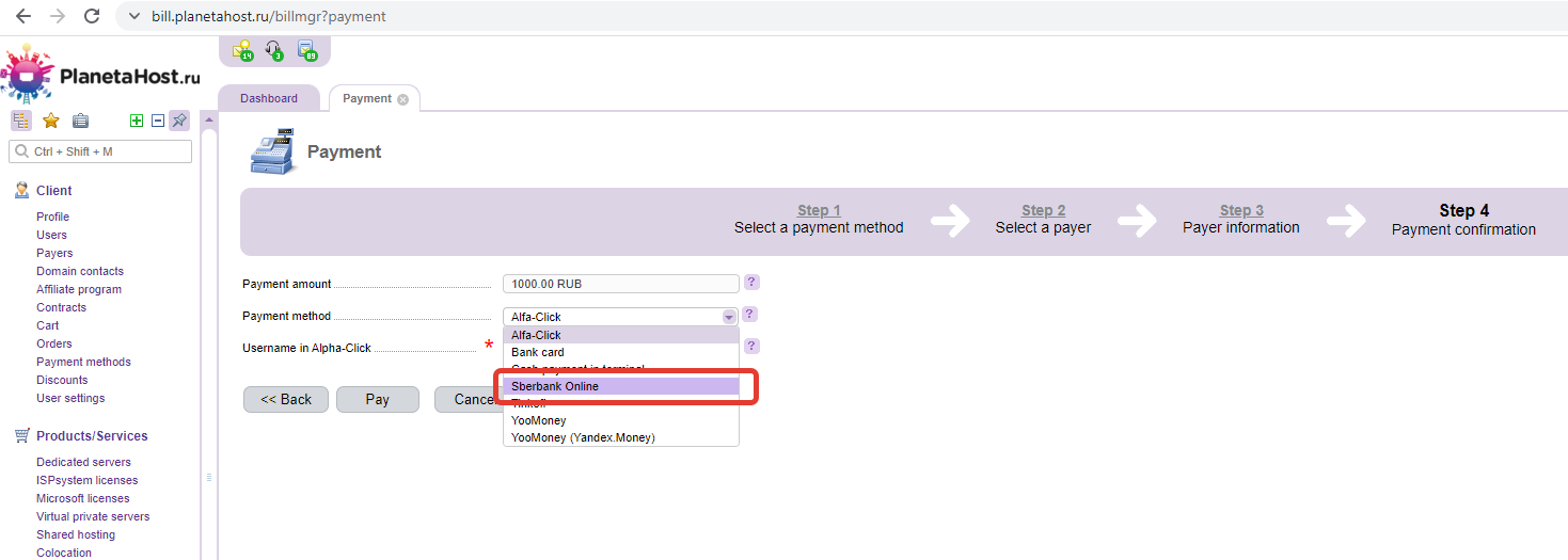 3. You need to choose a payment method and indicate the amount you would like to top up your account.Choose the payment method CBP (LLC "PLANETAHOST") and indicate the amount of replenishment of the account: