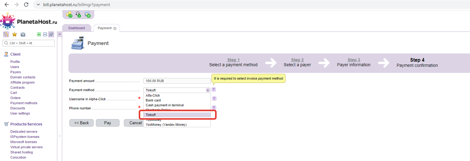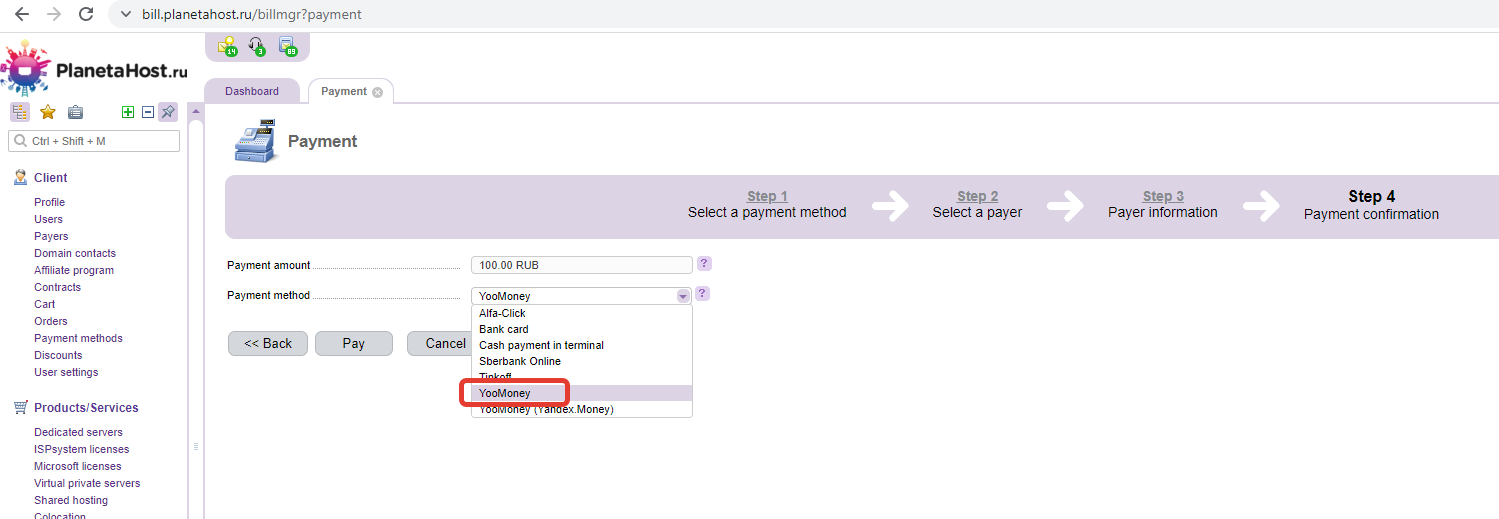 3. You need to choose a payment method and indicate the amount you would like to top up your account. We choose the payment method YooKassa (LLC "PLANETAHOST") and indicate the amount of replenishment of the account: