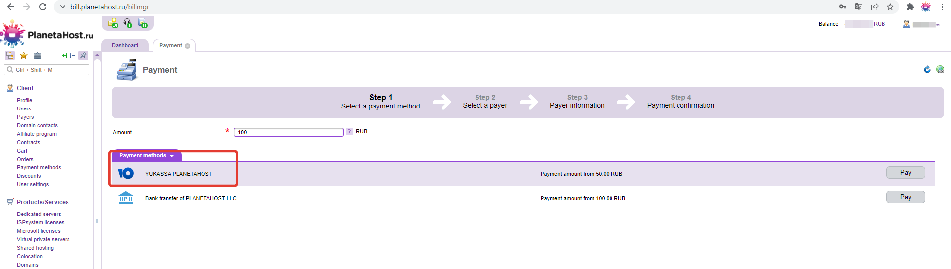 3. You need to choose a payment method and specify the amount by which you would like to add funds. Choose a payment method - YooKassa (LLC "PLANETAHOST") and indicate the amount of the account refill: